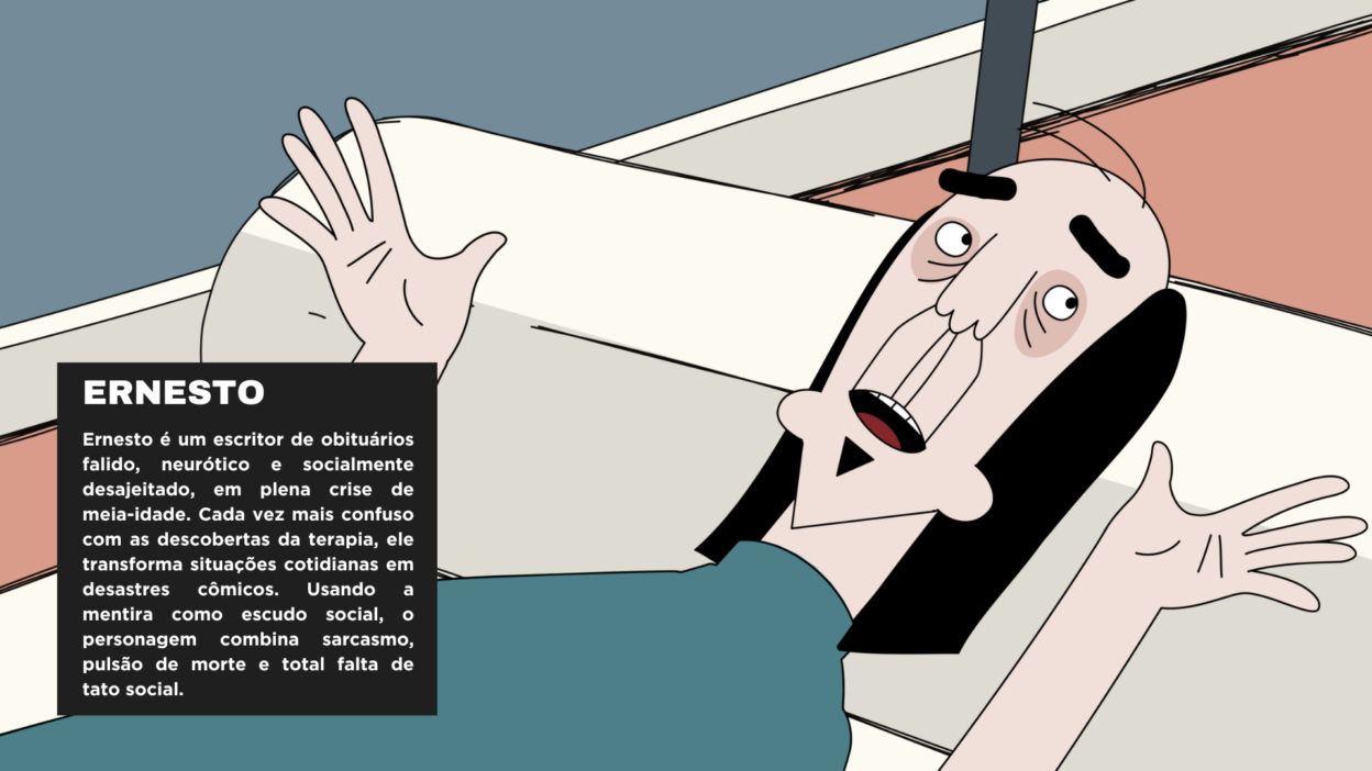 Após levar um fora, Ernesto, um escritor de obituários afundado na crise da meia-idade, embarca numa jornada tragicômica para encarar os demônios da masculinidade frágil. Dirigida por Fernanda Roque, Ernesto é uma série de humor adulto que mergulha nos abismos da autoestima, espiritualidade, sexualidade e sanidade de seu protagonista.